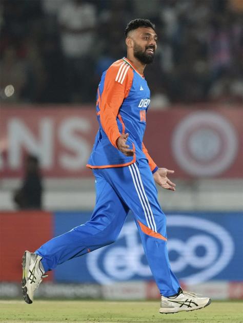 വിക്കറ്റ് വീഴ്ത്തിയ വരുണ്‍ ചക്രവര്‍ത്തിയുടെ ആഹ്ലാദം.  Photo: BCCI/x.com