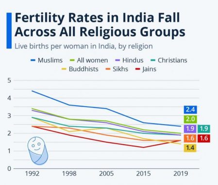 1951ന് ശേഷം ഇന്ത്യയിലെ വിവിധ മതവിഭാഗങ്ങളുടെ ജനസംഖ്യയില് നേരിയ തോതിലുള്ള മാറ്റങ്ങള് മാത്രമാണ് സംഭവിച്ചിട്ടുള്ളത്. സെന്സസ് ഡാറ്റ പ്രകാരം, കഴിഞ്ഞ മൂന്ന് പതിറ്റാണ്ടിനിടെ മുസ്ലിങ്ങളുടെ ജനസംഖ്യാ വളര്ച്ചാ നിരക്ക് കുറയുകയാണ് ചെയ്തത്.