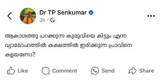 ഈ അറസ്റ്റിനെതിരെ ബി.ജെ.പി സംസ്ഥാന അധ്യക്ഷന് രാജീവ് ചന്ദ്രശേഖര് പ്രതിഷേധം അറിയിച്ചപ്പോള്, ‘ആകാശത്തു പറക്കുന്ന കുരുവിയെ കിട്ടും എന്ന വ്യാമോഹത്തില് കക്ഷത്തില് ഇരിക്കുന്ന പ്രാവിനെ കളയണോ?’എന്ന ഫേസ്ബുക്ക് പോസ്റ്റിലൂടെ സെന്കുമാര് പരിഹസിച്ചു.