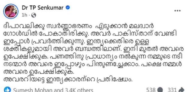 ഏറ്റവും ഒടുവിലായി, മലബാര് ഗോള്ഡിന് പാക്കിസ്ഥാനുമായി ബന്ധമുണ്ടെന്ന് ആരോപിച്ച്, ദീപാവലി പോലുള്ള ആഘോഷവേളകളില് അവിടെ നിന്ന് സ്വര്ണ്ണം വാങ്ങരുതെന്ന് അദ്ദേഹം ഫേസ്ബുക്കിലൂടെ ആഹ്വാനം ചെയ്തു. സ്ഥാപനത്തെ ‘മലദ്വാര് ഗോള്ഡ്’ എന്ന് വിശേഷിപ്പിച്ചുകൊണ്ടായിരുന്നു അദ്ദേഹത്തിന്റെ വിദ്വേഷ പ്രചാരണം.