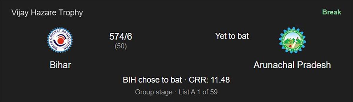 2022 വിജയ് ഹസാരെയില് അരുണാചലിനെതിരെ 502 റണ്സ് നേടിയ തമിഴ്നാടിന്റെ റെക്കോഡാണ് ഇതോടെ പഴങ്കഥയായത്. ലിസ്റ്റ് എയില് 500 റണ്സ് മാര്ക് പിന്നിടുന്ന രണ്ടാമത് ടീം കൂടിയാണ് ബീഹാര്.