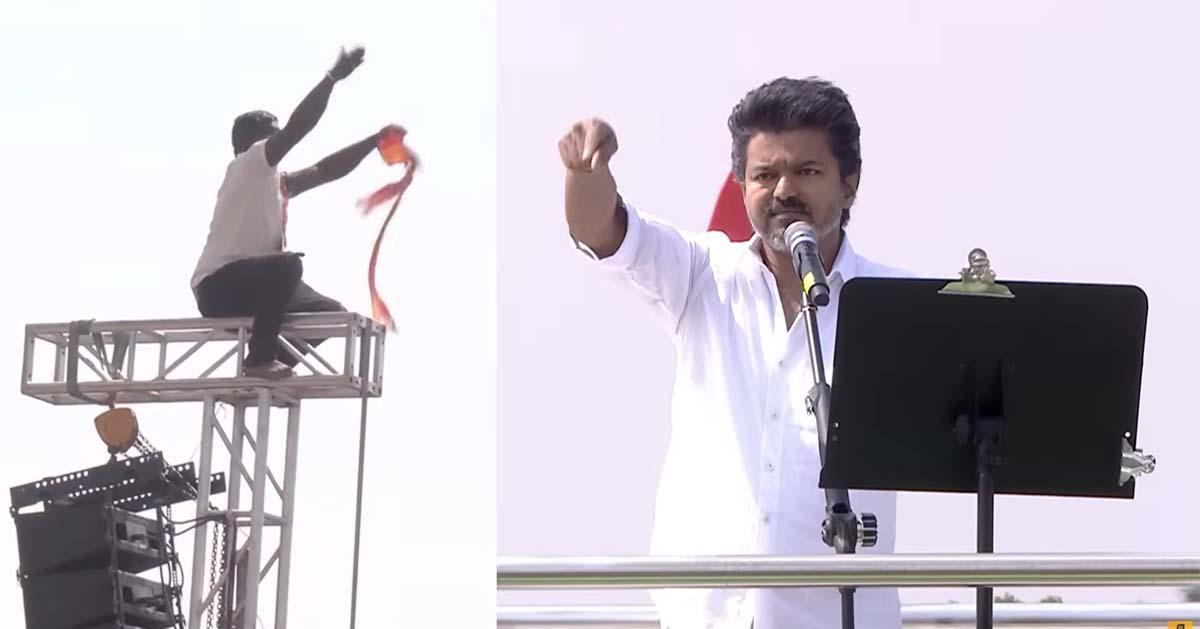 വിജയ് അധ്യക്ഷനായ ടി.വി.കെ പാര്ട്ടിയുടെ പുതുച്ചേരി സമ്മേളനത്തിലാണ് ട്രോളിന് കാരണമായ സംഭവം നടന്നത്. വിജയ് സംസാരിക്കുന്നതിനിടയില് സ്പീക്കറുകള് വെച്ച സ്റ്റാന്ഡിന് മുകളില് ഒരാള് കയറി നില്ക്കുകയും വിജയ്യുടെ നേരെ കൈവീശി കാണിക്കുകയും ചെയ്തിരുന്നു. അയാളോട് താഴെയിറങ്ങാന് വിജയ് ആവശ്യപ്പെടുന്നതിന്റെ വീഡിയോ വൈറലായി മാറി.
