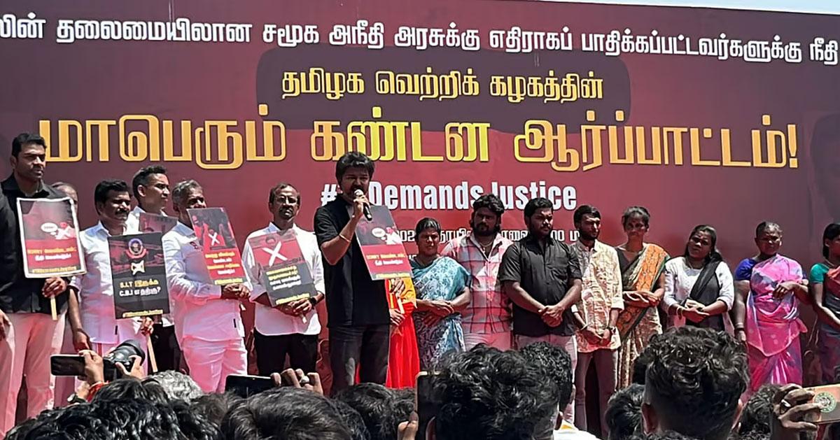 തമിഴ്നാട്ടില് അധികാരത്തിലിരിക്കുന്ന സ്റ്റാലിന്റെ നേതൃത്വത്തിലുള്ള ഡി.എം.കെ സര്ക്കാരിനെ സമരത്തില് വിജയ് കടന്നാക്രമിച്ചിരുന്നു. അണ്ണാ യൂണിവേഴ്സിറ്റി കേസ് മുതല് അജിത് കുമാര് കേസ് വരെ പരാമര്ശിച്ച വിജയ്, ഭരണകൂടത്തെ ‘സോറി മാ മോഡല്’ സര്ക്കാറെന്നാണ് വിശേഷിപ്പിച്ചത്.