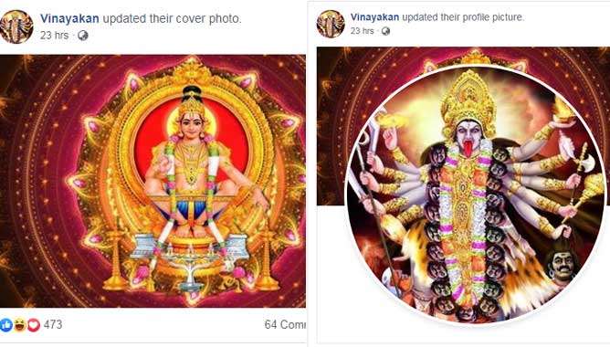 ഫേസ്ബുക്ക് പ്രൊഫൈല് ഫോട്ടോ കാളിയുടേയും കവര് ഫോട്ടോ അയ്യപ്പന്റേതും ആക്കിയാണ് വിനായകന് സംഘപരിവാറുകാര്ക്ക് മറുപടി നല്കുന്നത്.