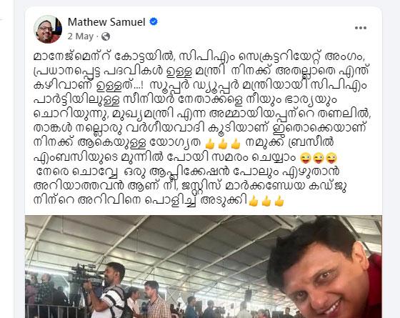 പിന്നീട് അങ്ങോട്ട് കേന്ദ്രസര്‍ക്കാരിനെ വിമര്‍ശിച്ചും കേരള സര്‍ക്കാരിനെയും പ്രതിപക്ഷ നേതാക്കളെയും പിന്തുണച്ചുകൊണ്ടുള്ള പ്രതികരണങ്ങളാണ് മാത്യു ശാമുവലില്‍ നിന്ന് ഉണ്ടാകുന്നത്.