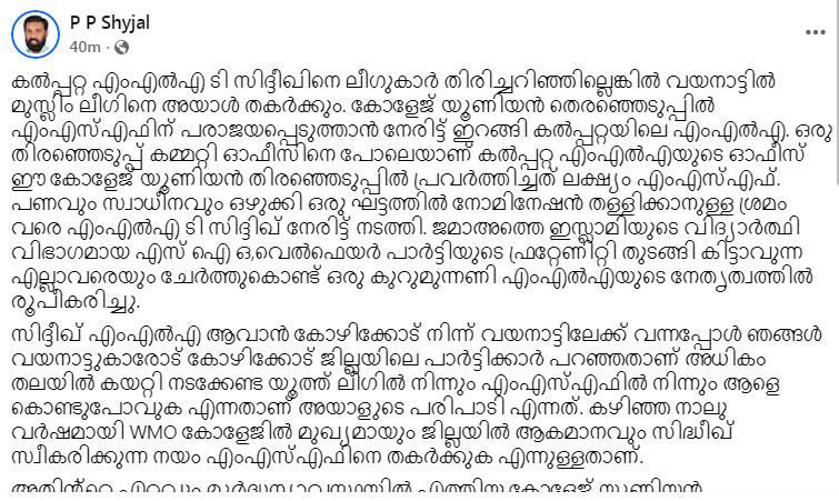 കല്‍പ്പറ്റ എം.എല്‍.എ ടി. സിദ്ദിഖിനെ ലീഗുകാര്‍ തിരിച്ചറിഞ്ഞില്ലെങ്കില്‍ വയനാട്ടില്‍ മുസ്‌ലിം ലീഗിനെ അദ്ദേഹം തകര്‍ക്കുമെന്ന് മുന്‍ വയനാട് എം.എസ്.എഫ് അധ്യക്ഷന്‍ പി.പി. ഷൈജില്‍ പ്രതികരിച്ചു. എം.എല്‍.എയാകാന്‍ സിദ്ദിഖ് കോഴിക്കോട് നിന്ന് വയനാട്ടിലേക്ക് വന്നപ്പോള്‍ തങ്ങള്‍ വയനാട്ടുകാരോട് കോഴിക്കോട് ജില്ലയിലെ പാര്‍ട്ടിക്കാര്‍ പറഞ്ഞതാണ് അധികം തലയില്‍ കയറ്റി നടക്കേണ്ട എന്നും ഷൈജില്‍ പറഞ്ഞു.