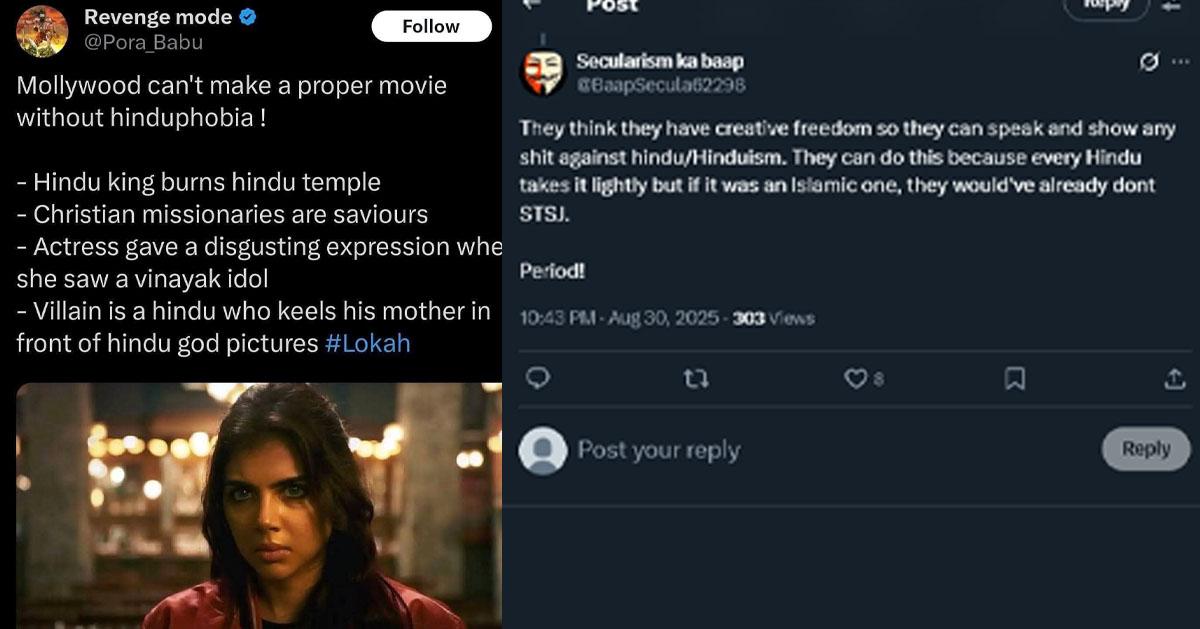 ചിത്രത്തിനെതിരെ തീവ്ര വലതുപക്ഷ ചായ്വുള്ള ചില പേജുകള് എക്സില് രംഗത്തെത്തി. ഹിന്ദുഫോബിയ നിറഞ്ഞ ചിത്രമാണ് ലോകഃ എന്നാണ് ചിലര് വാദിച്ചത്. മലയാളത്തില് നിന്ന് ഇറങ്ങുന്ന സിനിമകളെല്ലാം ഹിന്ദുവിരുദ്ധമാണെന്നും അതിന്റെ ഏറ്റവുമൊടുവിലത്തെ ഉദാഹരണമാണ് ലോകഃ എന്നും ഇത്തരക്കാര് ആരോപിക്കുന്നു. മുസ്ലിമായ നിര്മാതാവും ക്രിസ്ത്യാനിയായ സംവിധായകനും ചേര്ന്ന് ഒരുക്കിയ ഹിന്ദുവിരുദ്ധ സിനിമയെന്നും ലോകഃയെ വിമര്ശിക്കുന്നവരുണ്ട്.