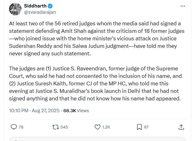 എന്നാല്‍ 56 ജഡ്ജിമാരുടെ പട്ടികയില്‍ തന്റെ പേര് ഉള്‍പ്പെടുത്താന്‍ സമ്മതം നല്‍കിയിട്ടില്ലെന്ന് മുന്‍ സുപ്രീം കോടതി ജഡ്ജിയായ എസ്. രവീന്ദ്രനും താന്‍ എവിടെയും ഒപ്പിട്ടിട്ടില്ലെന്ന് മധ്യപ്രദേശ് ഹൈക്കോടതിയിലെ മുന്‍ ചീഫ് ജസ്റ്റിസ് സുരേഷ് കൈത്തും പറഞ്ഞതായി മാധ്യമപ്രവര്‍ത്തകന്‍ സിദ്ധാര്‍ഥ് വരദരാജന്‍ പറയുന്നു. എക്സിലൂടെയാണ് അദ്ദേഹത്തിന്റെ പ്രതികരണം.