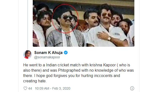 ഷഹീന്ബാഗില് നടന്ന വെടിവെപ്പിനെതിരെ സോനം ചെയ്ത് ട്വീറ്റിനു കമന്റായാണ് ഒരാള് അനില് കപൂറും ദാവൂദ് ഇബ്രാഹിമും ഒപ്പം നില്ക്കുന്ന ഫോട്ടോ പോസ്റ്റ് ചെയ്തത്.