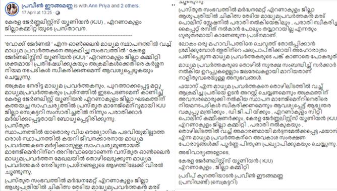സംഭവത്തില് പ്രതിഷേധവുമായി കേരള ജേര്ണലിസ്റ്റ്സ് യൂണിയന് എറണാകുളം ജില്ലാ കമ്മിറ്റി രംഗത്തെത്തിയിരുന്നു. അക്രമികള്ക്കെതിരെ കര്ശന നിയമ നടപടികള് സ്വീകരിക്കണമെന്നും യൂണിയന് ആവശ്യപ്പെട്ടു.