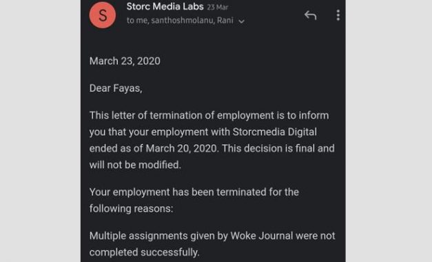 ‘ഇനി ഒരു അറിയിപ്പുണ്ടാകുന്നതു വരെ സ്ഥാപനത്തിലേക്ക് വരേണ്ടതില്ലെന്നും ഈ മാസത്തെ ശമ്പളം മുഴുവന് തരുന്നതാണെന്നും അറിയിച്ചു. എന്നാല് മാര്ച്ച് 23ന് എന്നെ ജോലിയില് നിന്നും പിരിച്ചു വിടുകയാണെന്ന് കാണിച്ച് മെയില് വന്നു. ഇതുപോലെ മറ്റു നാലു മാധ്യമപ്രവര്ത്തകര്ക്കും മെയില് വന്നു’, ഫയാസ് പറയുന്നു.