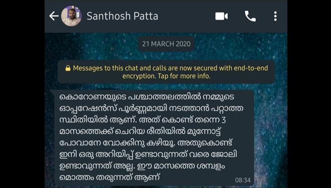 കൊറോണ കാരണം സാമ്പത്തിക ബുദ്ധിമുട്ടിലായതിനാല് മൂന്നു മാസത്തേക്ക് ചെറിയ രീതിയിലേ മുന്നോട്ട് പോകാന് കഴിയുകയുള്ളുവെന്ന് സ്ഥാപനത്തിലെ ഡയറക്ടര് ബോര്ഡ് അംഗമായ സന്തോഷ് പട്ടത്തില് മെസേജ് ചെയ്ത് അറിയിക്കുകയായിരുന്നെന്ന് ഫയാസ് പറയുന്നു.